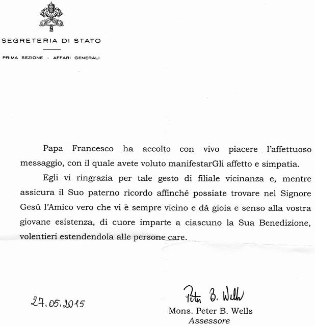 E' la risposta che Papa Francesco ha voluto inviare alla "letterina", che i nostri quattro ragazzi: Angelica, Aurora, Fabio e Michael (in rigoroso ordine alfabetico...) avevano consegnato al Card. Domenico Calcagno durante il bell'incontro informale ed amichevole che avevamo avuto in oratorio dopo la celebrazione, più solenne, della confermazione accompagnati anche dalla loro catechista Rita ed Omar.