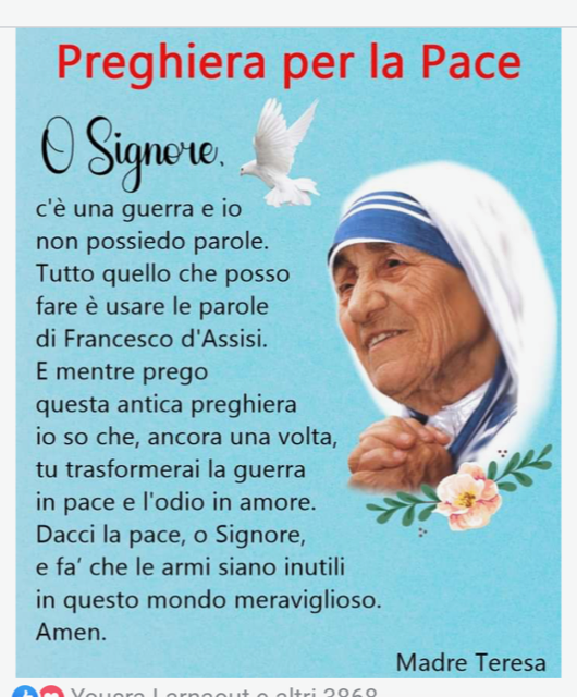 Da un post di un amico pubblicato oggi su whatsapp. Visto il periodo ho pensato di pubblicarlo acchè i lettori possano unirsi alla preghiera di Madre Teresa. Vi ricordo di sfogliare Il Vangelo ed il Santo del giorno per trarre altri spunti. Buona Giornata Rnd